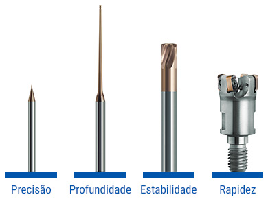 A produção de formas complexas requer muitas etapas de trabalho com diferentes tipos de ferramentas de corte. As nossas ferramentas não são apenas caracterizadas por uma qualidade consistente. Com a nossa tecnologia, abrangemos ainda mais toda a cadeia de processos no fabrico de ferramentas e moldes. Da precisão ultrafina (diâmetro até 0,03 mm), até à máxima flexibilidade e produtividade no processamento em profundidade, passando pelo processamento rápido e fiável em materiais de elevada dureza.